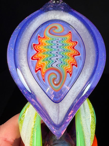 Double flower Sherlock, with pink crushed opal & Bright green Dichroic leaves